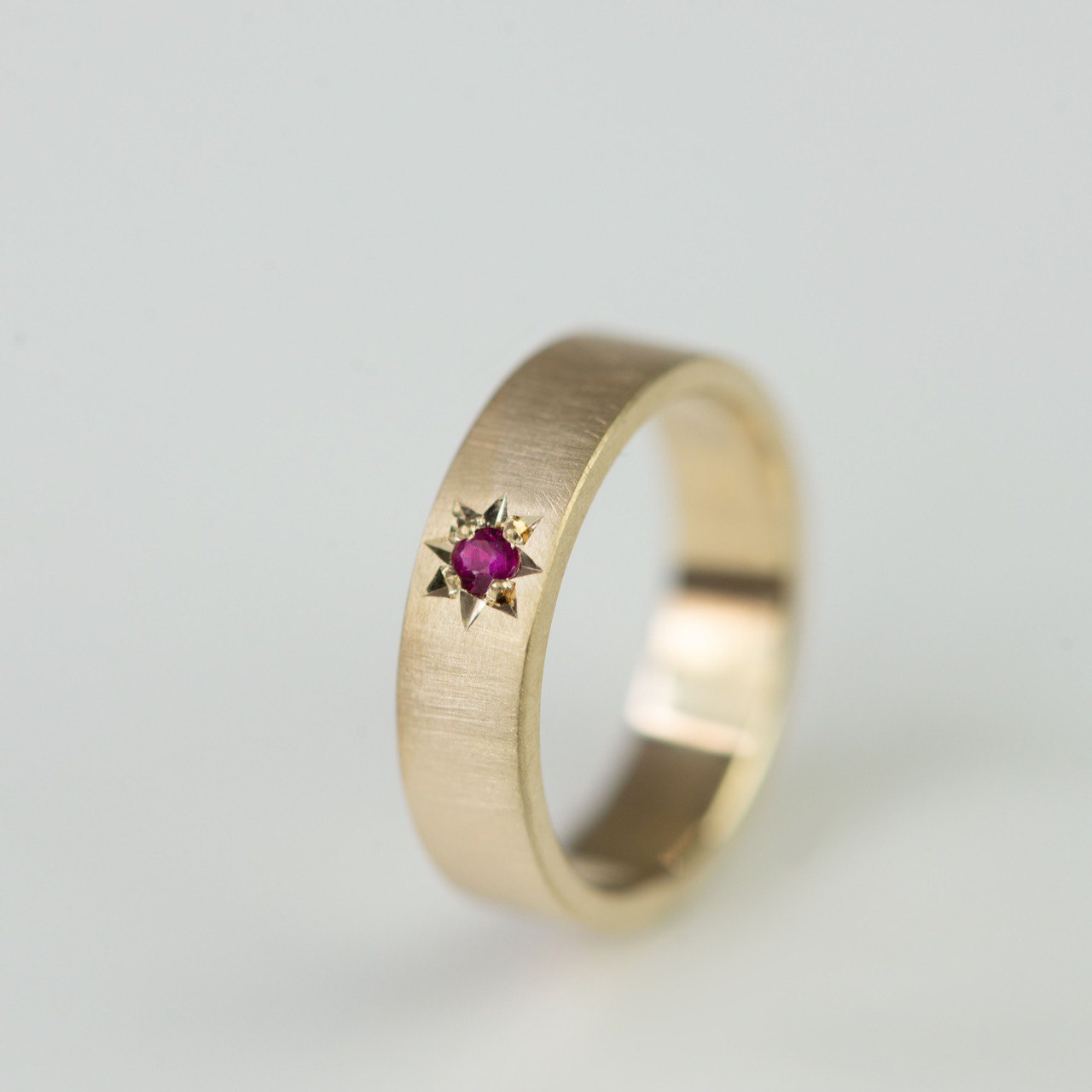 Special Design Note: Due to the narrower width of the ring, the star-shaped settings for the stones will be reduced in height, maintaining the ring’s sleek and proportional design.