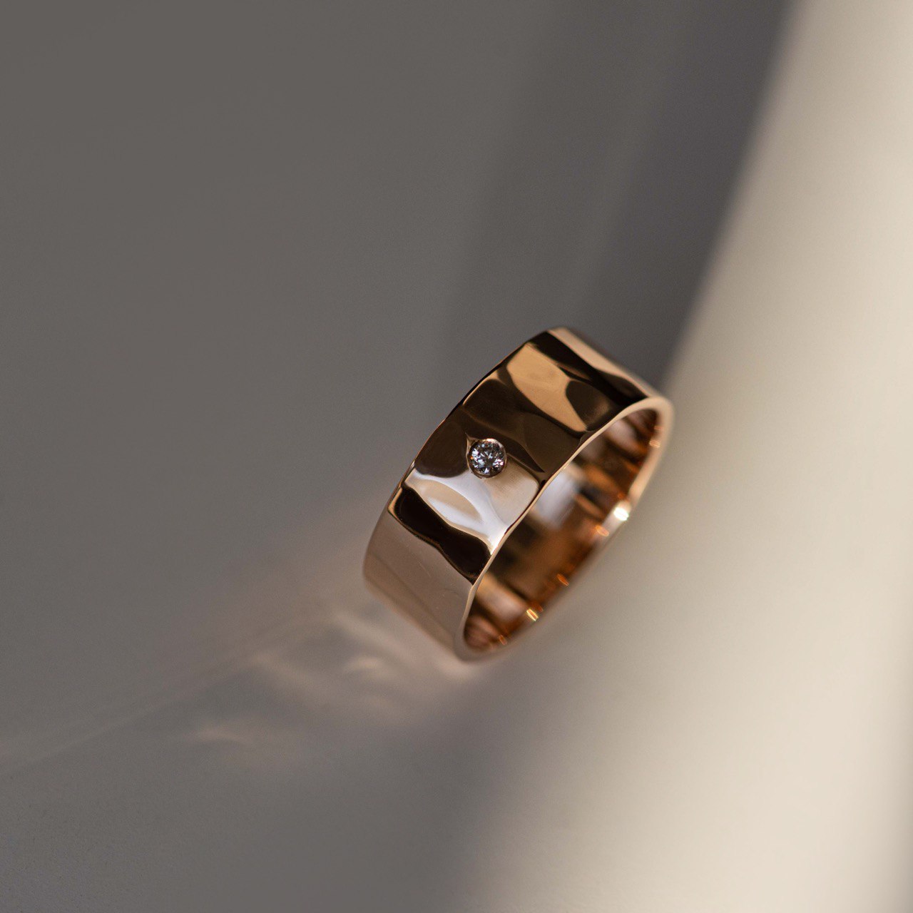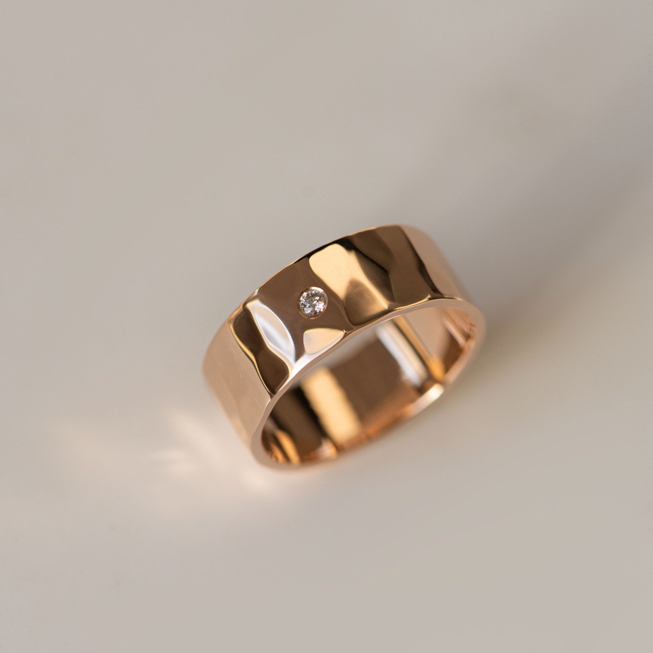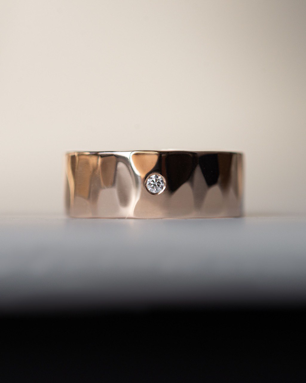 Default Stone Setting: The ring is standardly adorned with 2mm stones. Notably, bezel settings are exclusively used for our hammered textures.