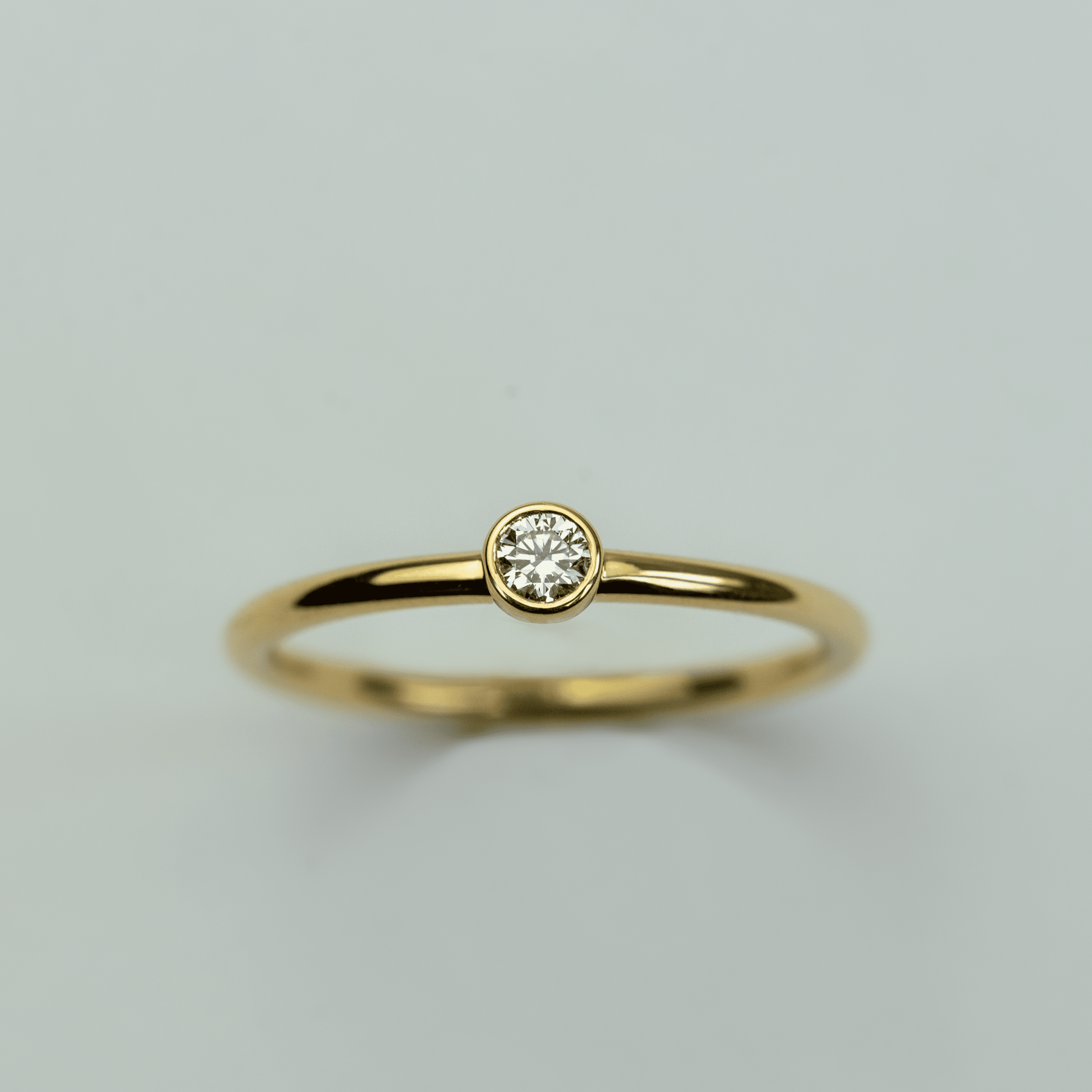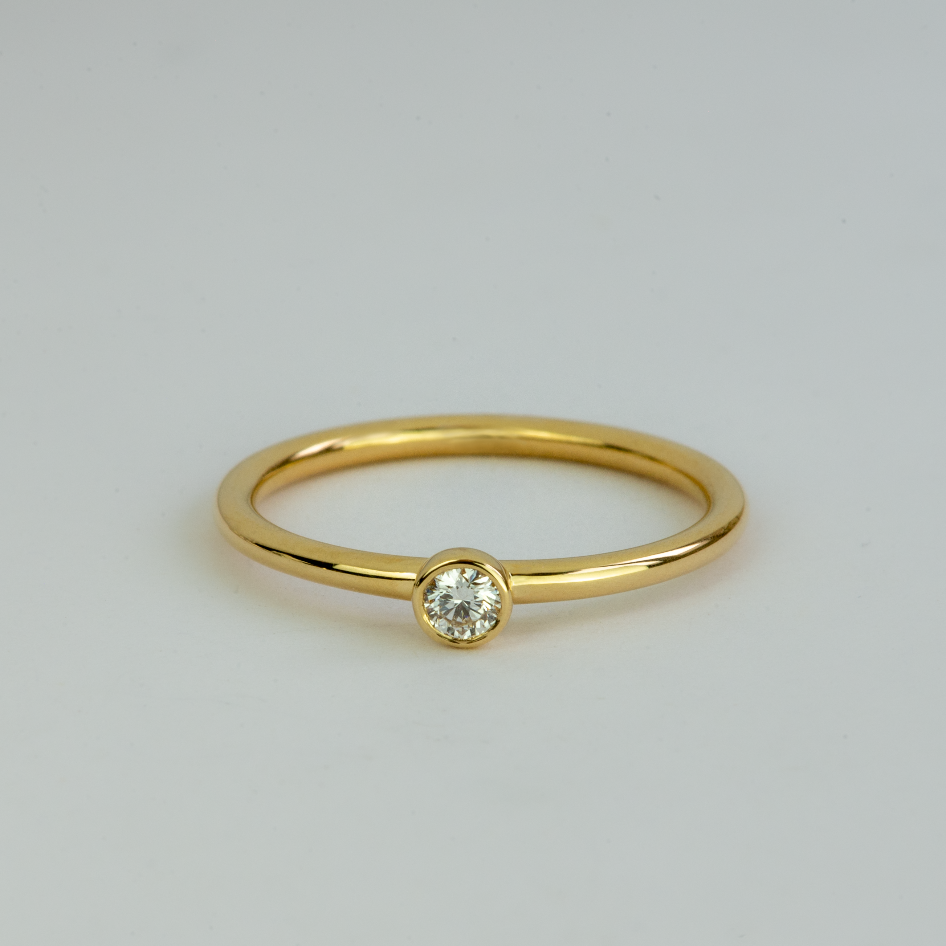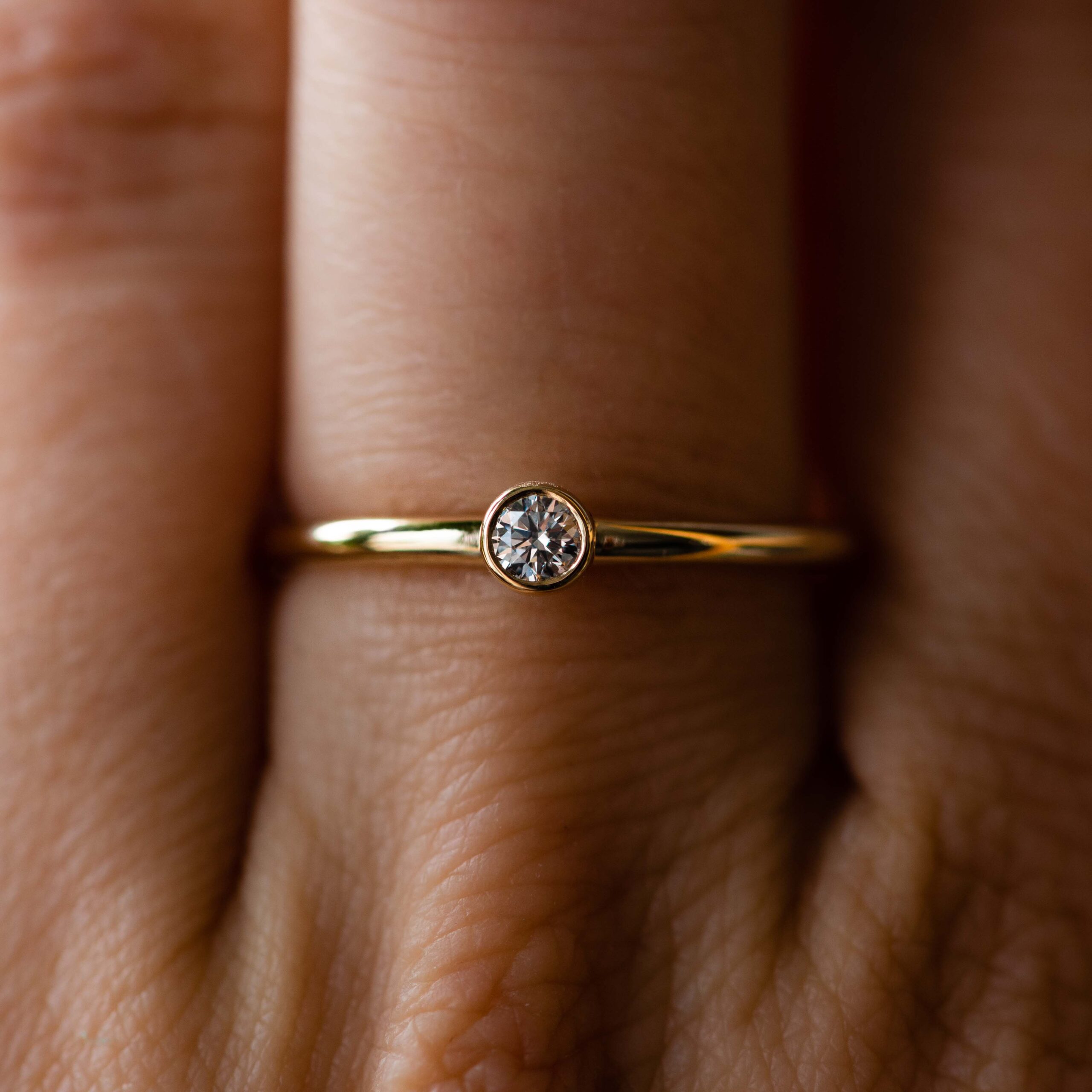 This elegant ring, featuring a bezel setting, is designed with a 2mm wire-round profile, making it a charming choice for an engagement ring. The primary product image showcases a brilliant diamond encased in yellow gold, creating a timeless and sophisticated look. The design ensures a sleek and comfortable fit, perfect for everyday elegance.