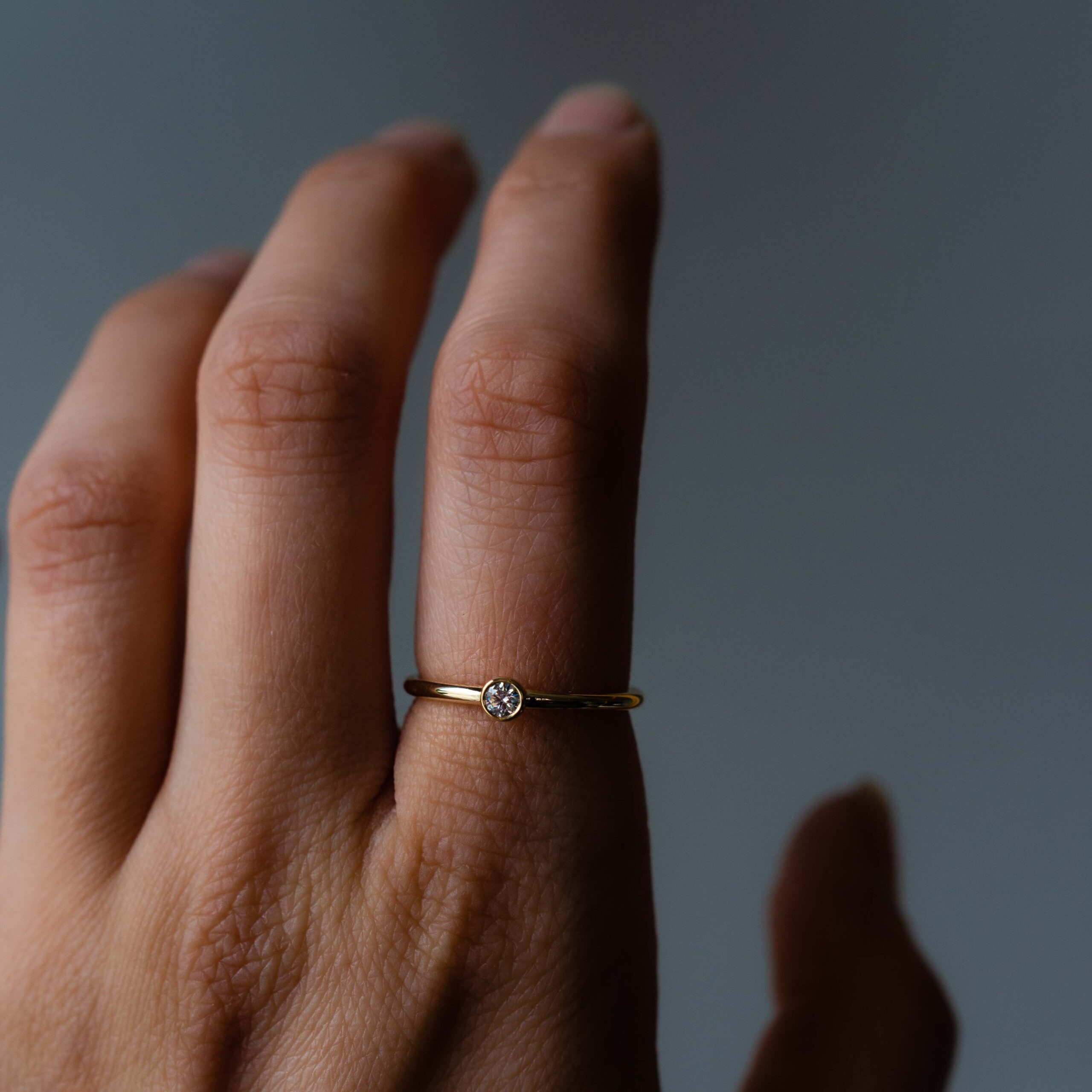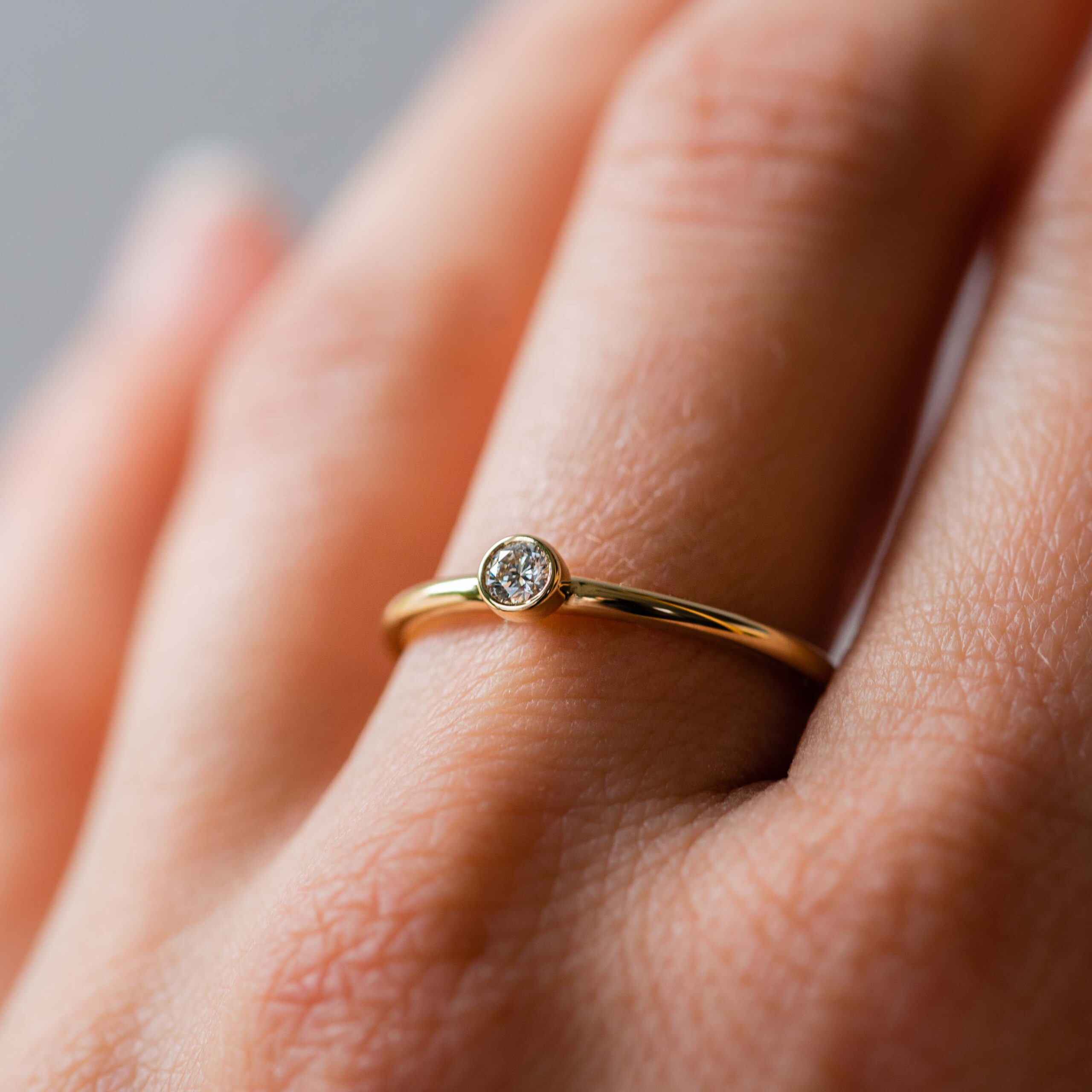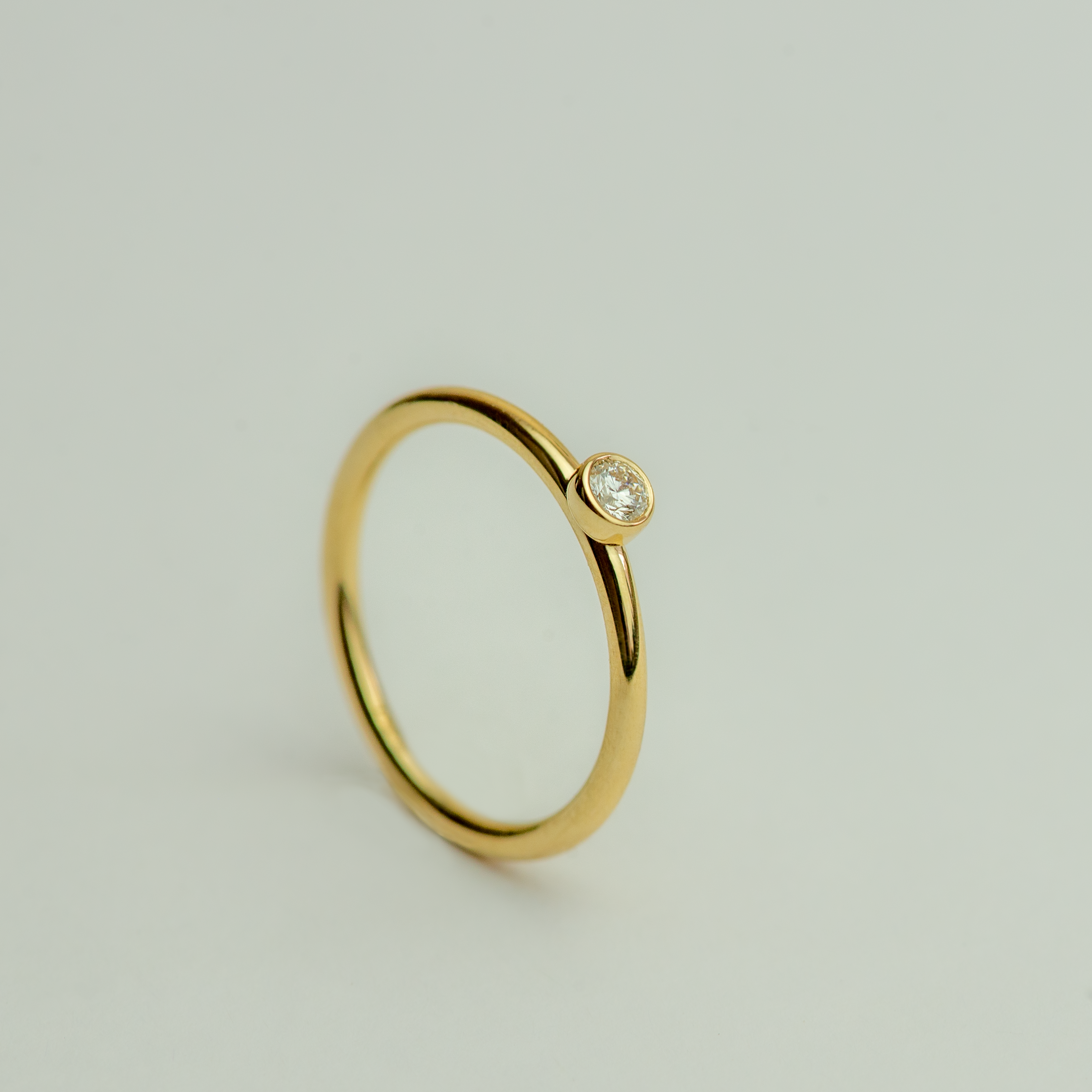 This elegant ring, featuring a bezel setting, is designed with a 2mm wire-round profile, making it a charming choice for an engagement ring. The primary product image showcases a brilliant diamond encased in yellow gold, creating a timeless and sophisticated look. The design ensures a sleek and comfortable fit, perfect for everyday elegance.